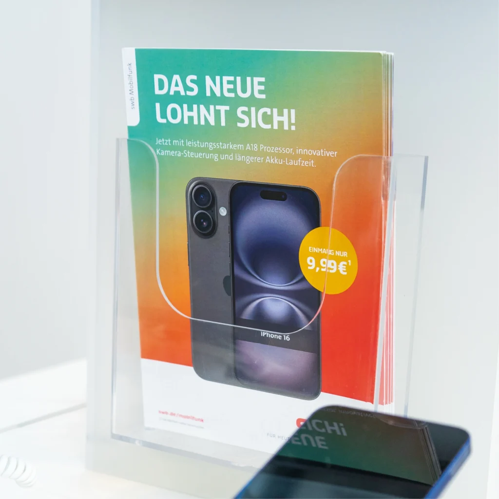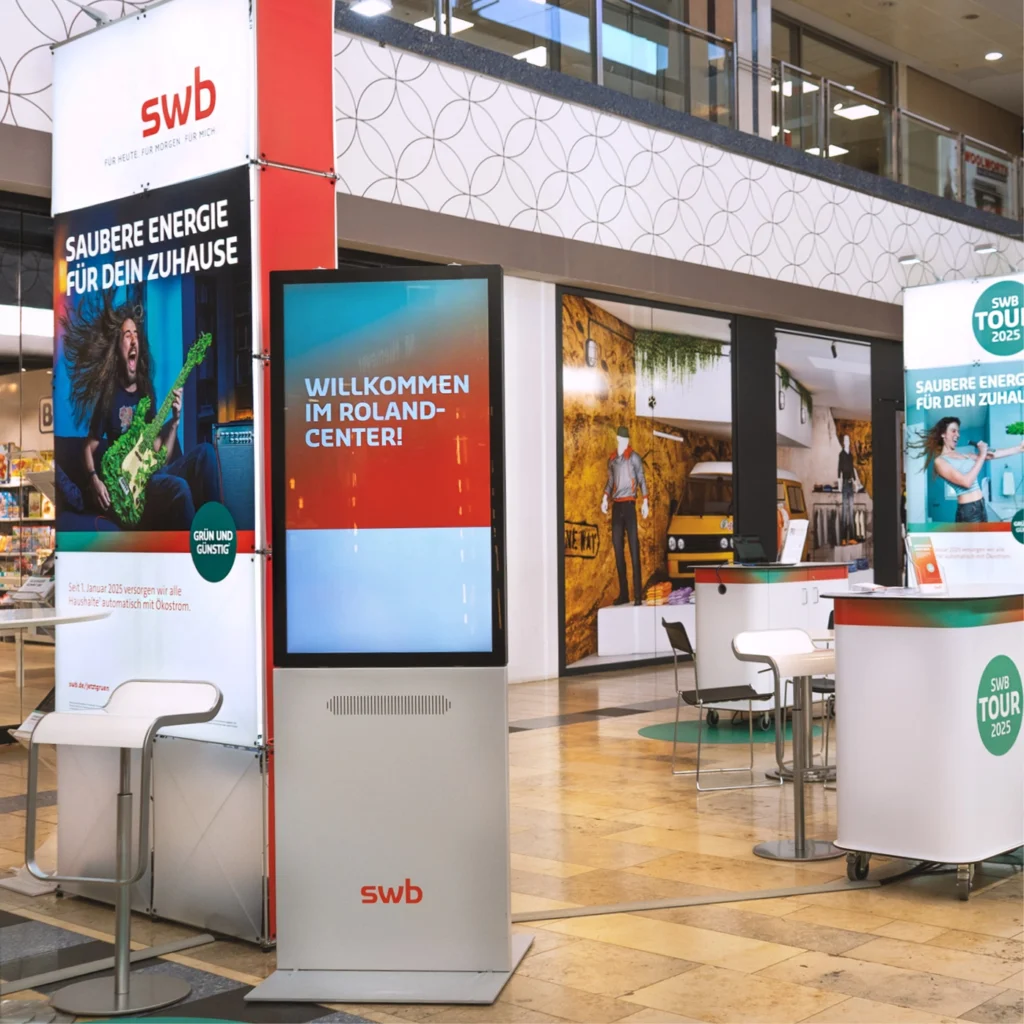Mit der erfolgreichen Umsetzung der mobilen swb-Kundencenter-Tour schaffen wir für unseren Kunden eine starke Präsenz direkt vor Ort und stärken die Kundenbindung durch persönliche Beratung, Serviceorientierung und interaktive Erlebniselemente. Zudem betreuen wir die digitale Ausstattung der stationären Kundencenter vor Ort sowie weitere Messeauftritte, um die swb über alle Kanäle hinweg sichtbar und erlebbar zu machen.