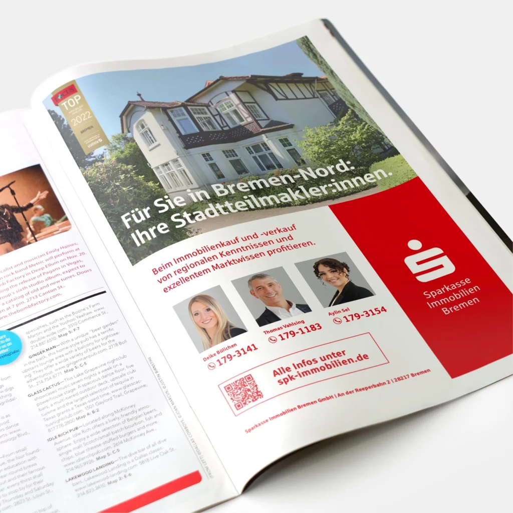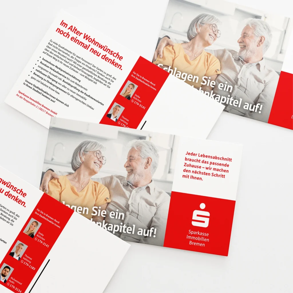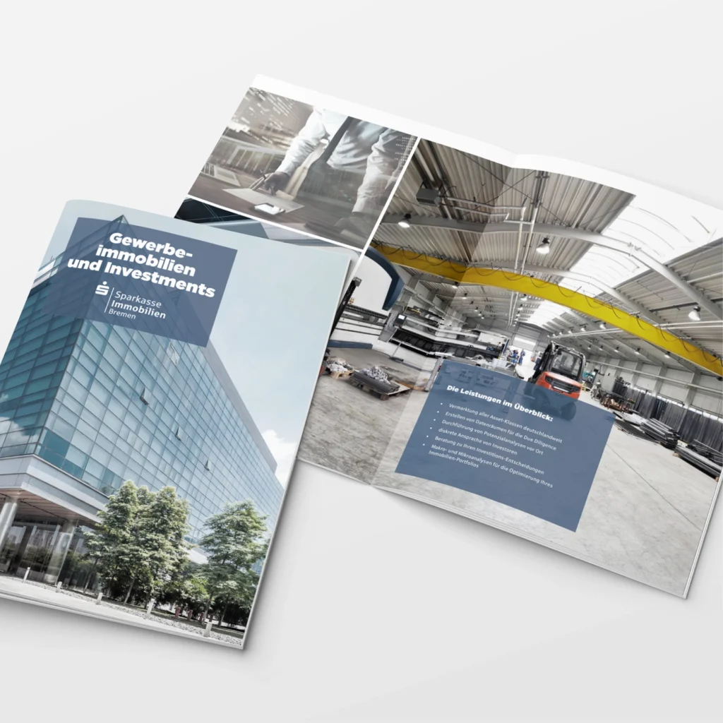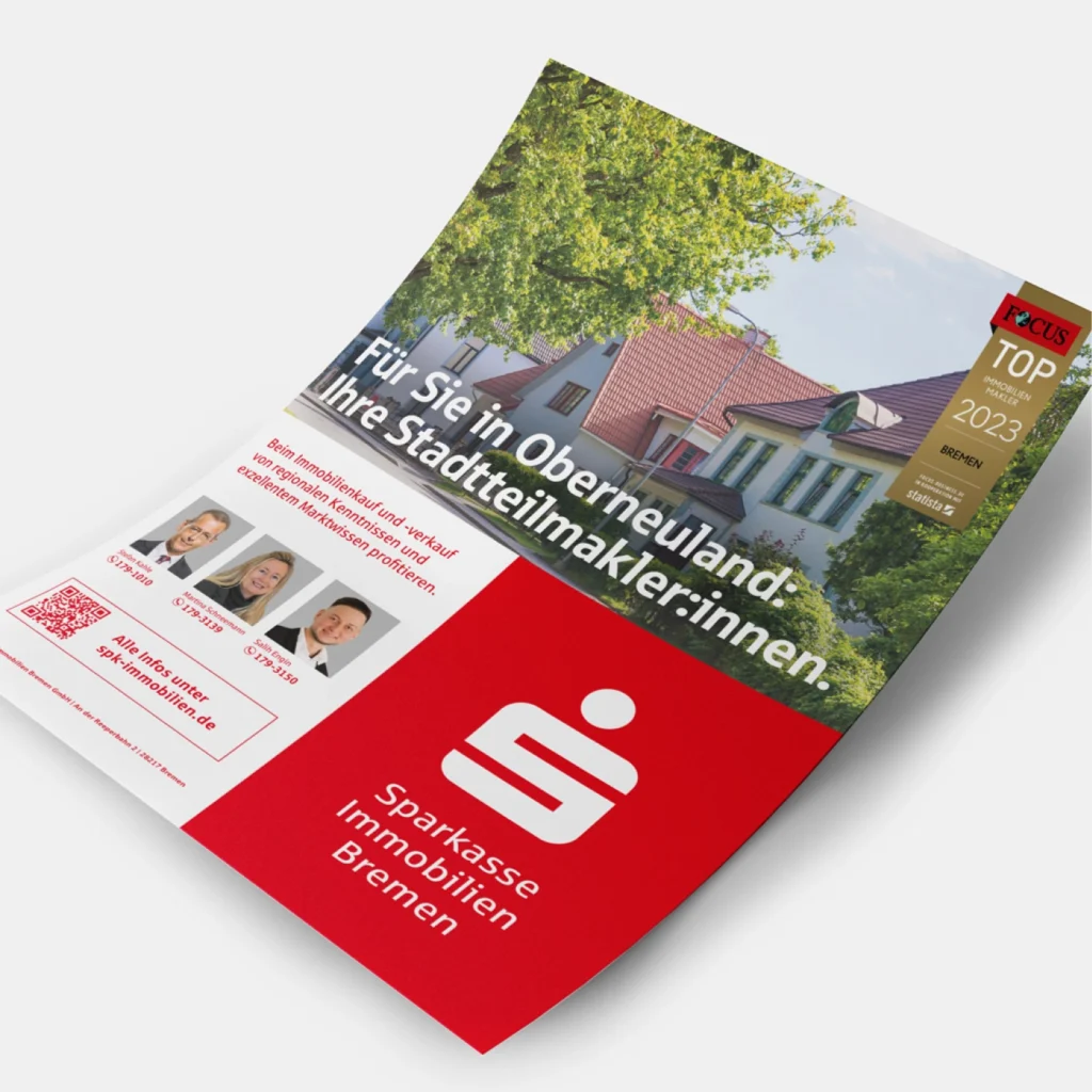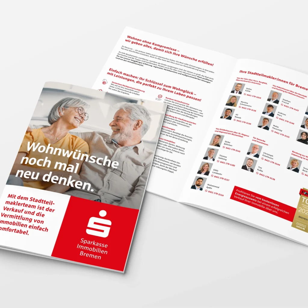 Darüber hinaus unterstützen wir bei der Erstellung von hochwertigen Exposés, Imagebroschüren und Informationsmaterialien, die sowohl online als auch im direkten Kundendialog zum Einsatz kommen. So entsteht ein konsistenter Markenauftritt, der die Professionalität und Kundennähe der Sparkasse Immobilien Bremen widerspiegelt.