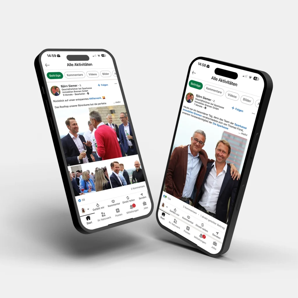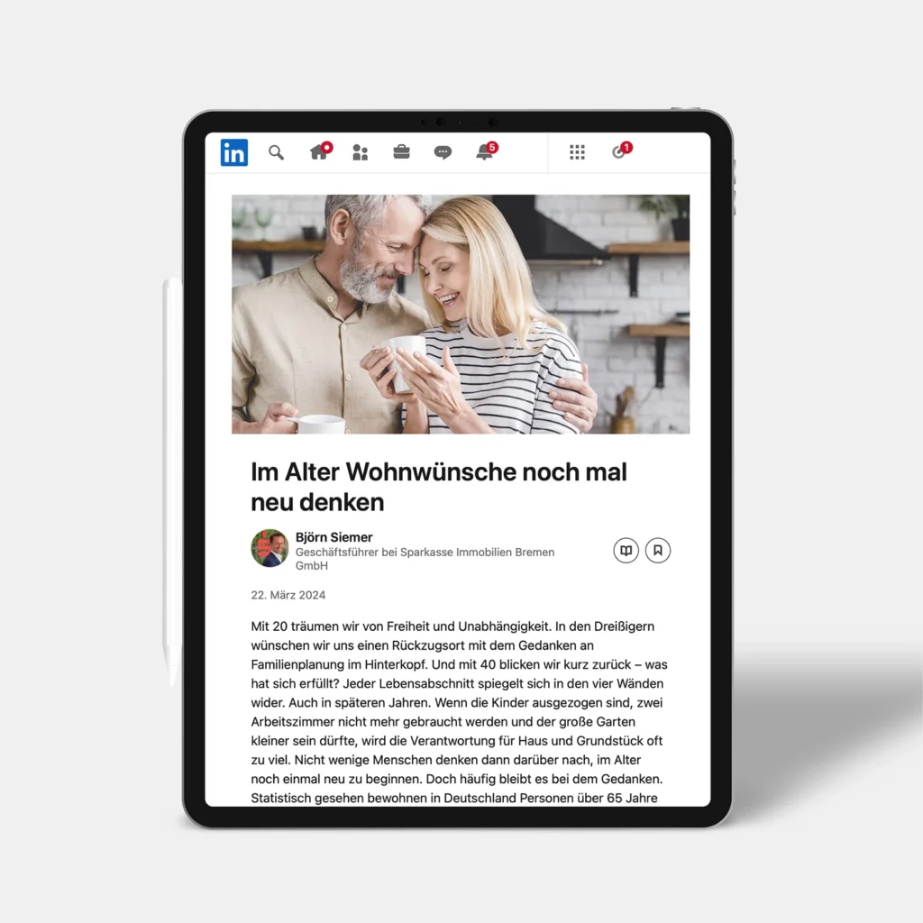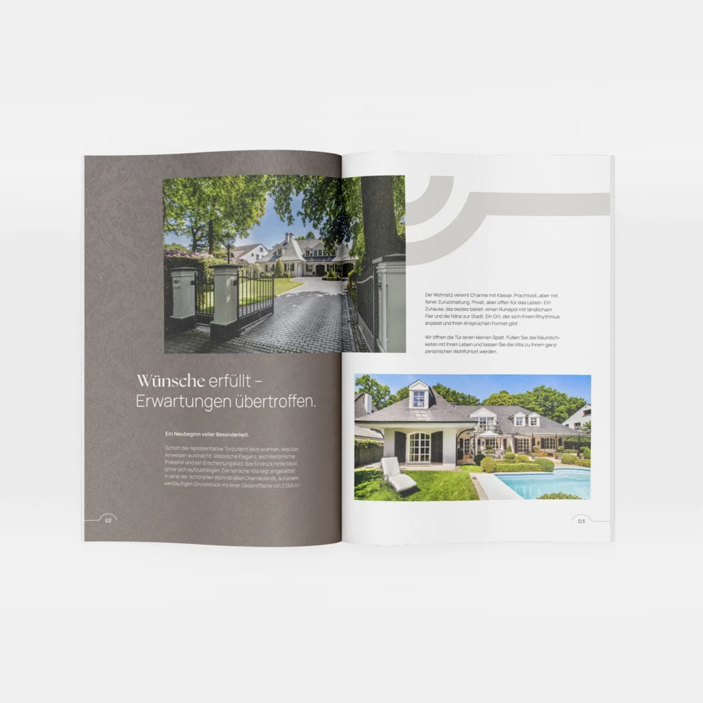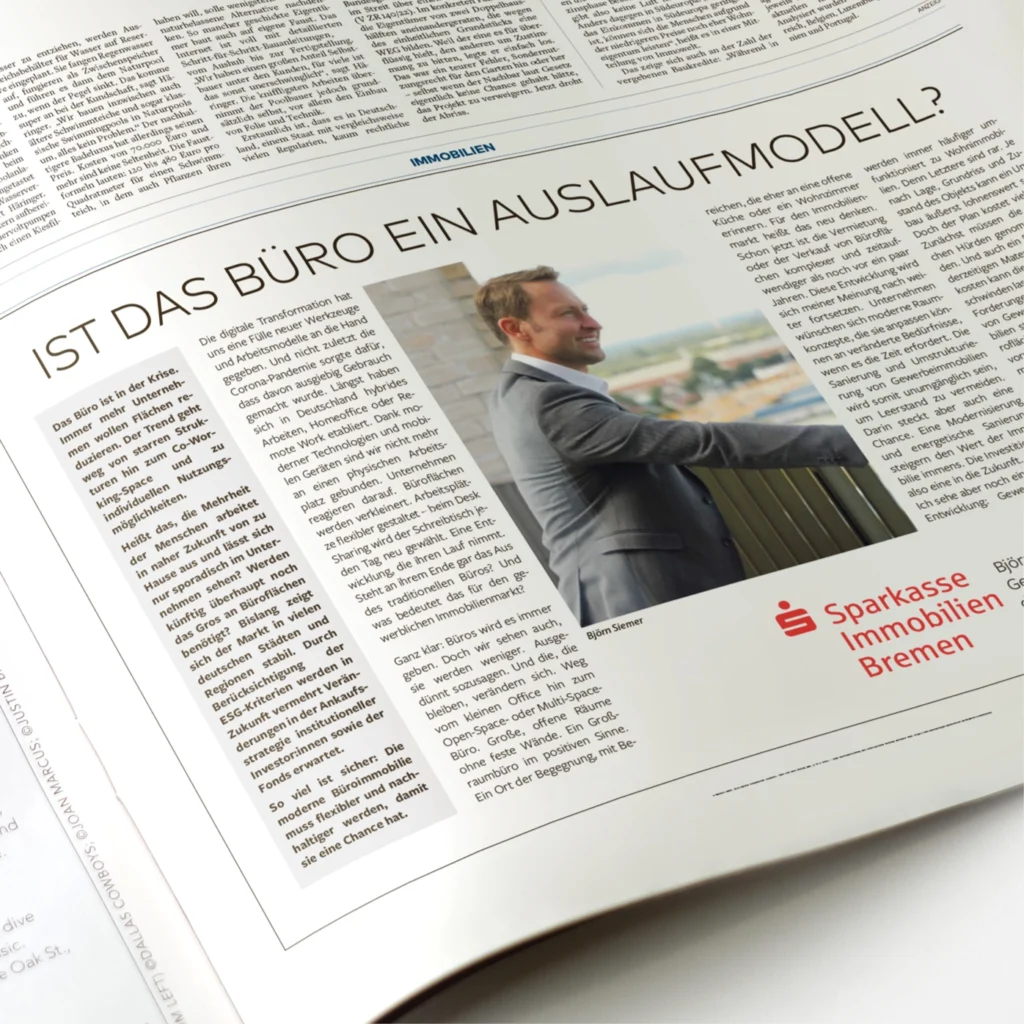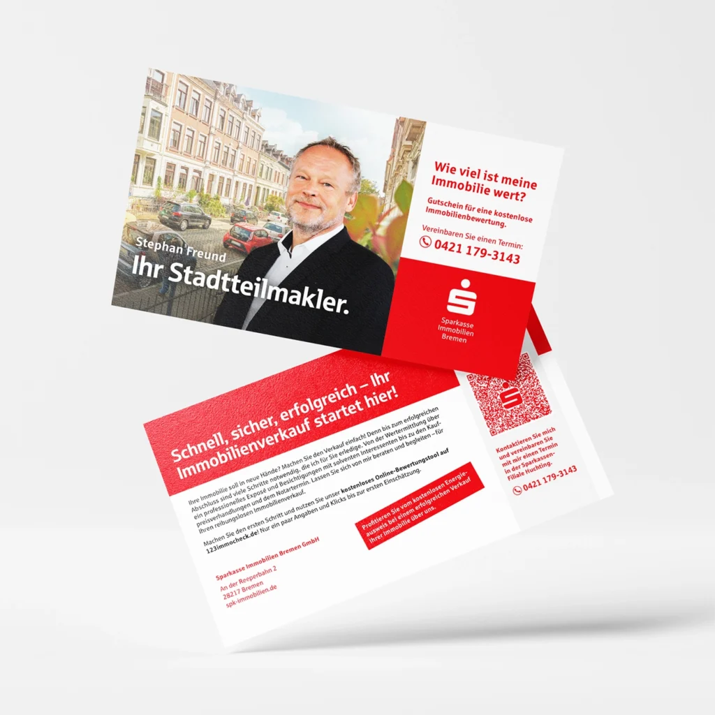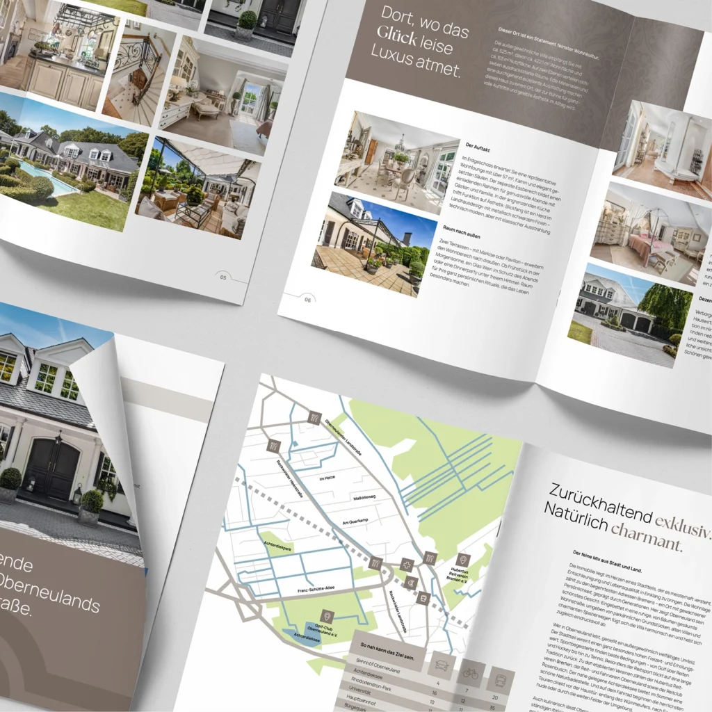 Darüber hinaus unterstützen wir bei der Erstellung von hochwertigen Exposés, Imagebroschüren und Informationsmaterialien, die sowohl online als auch im direkten Kundendialog zum Einsatz kommen. So entsteht ein konsistenter Markenauftritt, der die Professionalität und Kundennähe der Sparkasse Immobilien Bremen widerspiegelt.