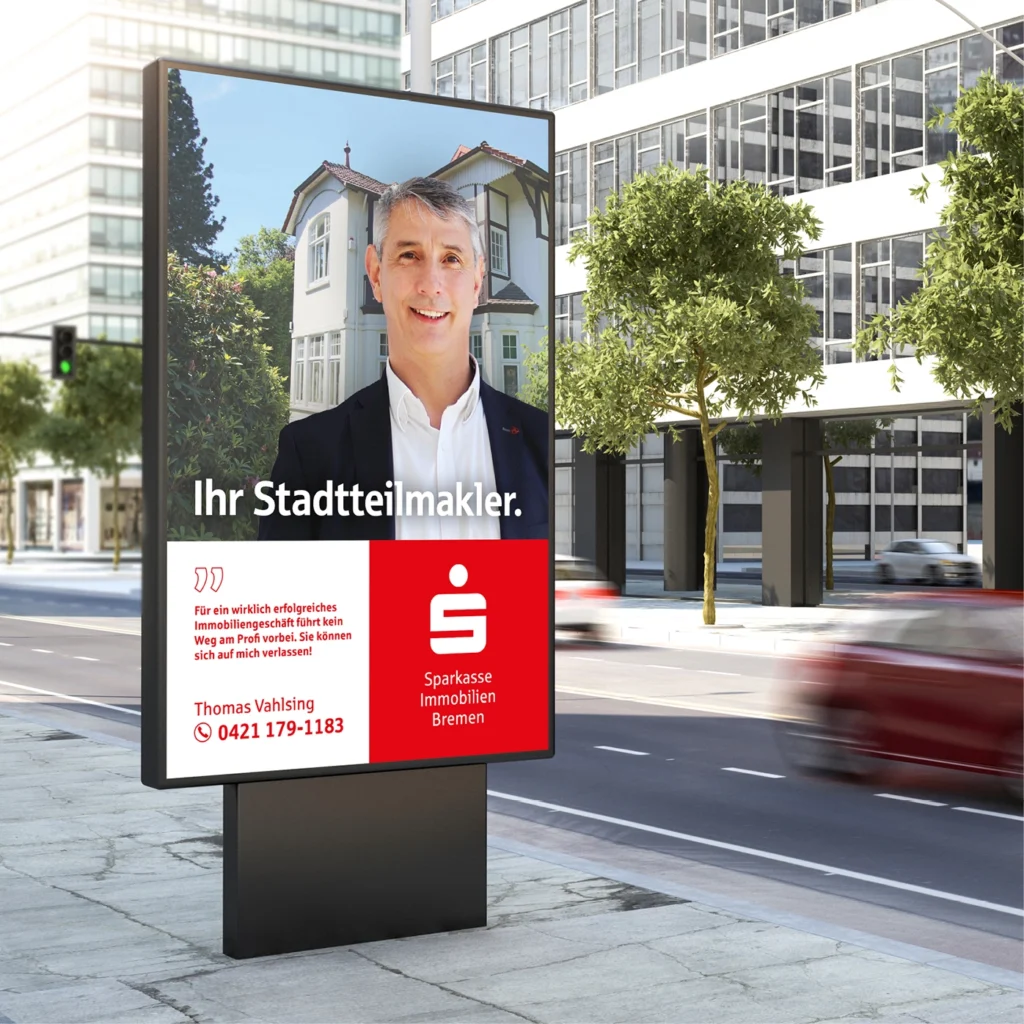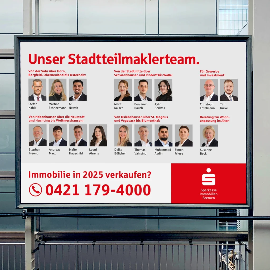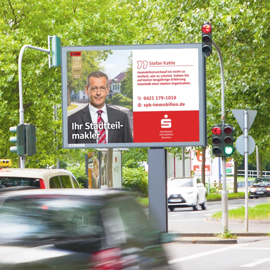 Ein neues Zuhause zu finden, ist immer mit besonderen Erwartungen und individuellen Bedürfnissen verbunden. Deshalb setzt die Sparkasse Immobilien Bremen auf ein flächendeckendes Netzwerk aus Stadtteilmaklerteams, die ihre Regionen genau kennen, über fundiertes lokales Wissen verfügen und eng mit den Menschen vor Ort vernetzt sind. Dieses Konzept begleiten wir als Werbeagentur in Bremen seit mehreren Jahren medienübergreifend in der Entwicklung und Umsetzung. Von aufmerksamkeitsstarken Out-of-Home-Kampagnen über ansprechende Print-und Digitalanzeigen sowie Content für Social Media bis hin zu Thought Leadership Strategien.